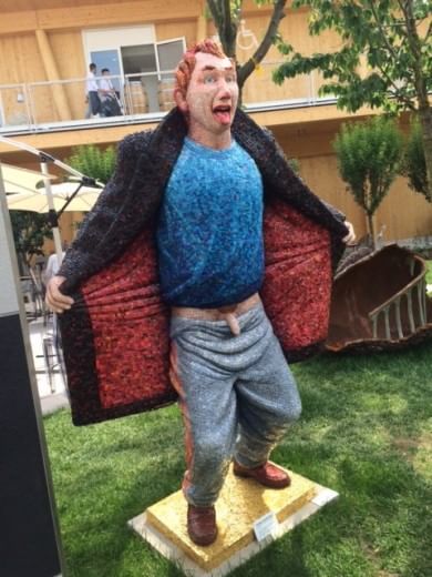 Meglio uscire. Finalmente fuori. Il cielo azzurro sopra di noi… l’Esibizionista di Athos Ongaro davanti a noi! Impermeabile aperto e pantaloni calati col bigolo in vista.