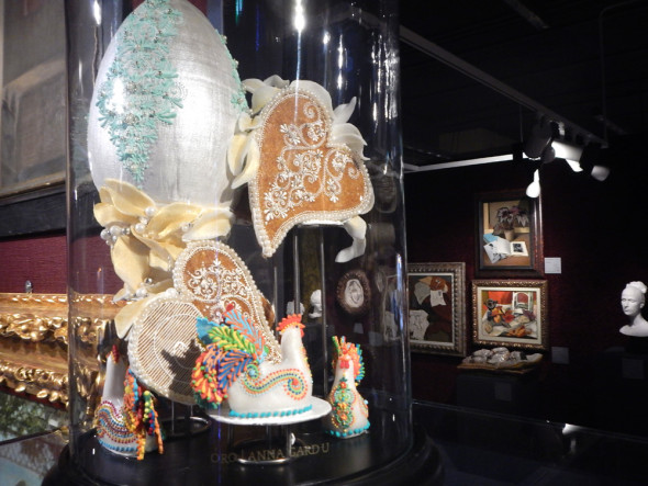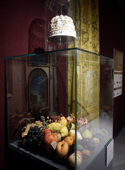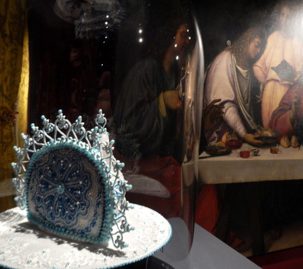 Va beh, vedrai che sarà molto meglio dentro, lascia perdere questo, sei solo all’inizio mi ripetevo. “Tu chiamale se vuoi illusioni”, speranze mal riposte. Vai con gli improbabili accostamenti nonsense. Frutta piemontese di Francesco Garnier Valletti coronata da pizzi alimentari sardi, perché dovete sapere che qua e là per la mostra, sopra qualche teca o a fianco a qualche opera, compaiono panettoni di pizzo e biscottini impizzettati. No, davvero, ci sono pure dei galletti ricamati.