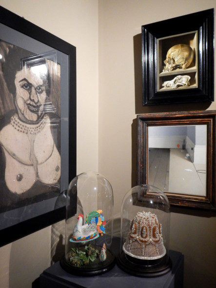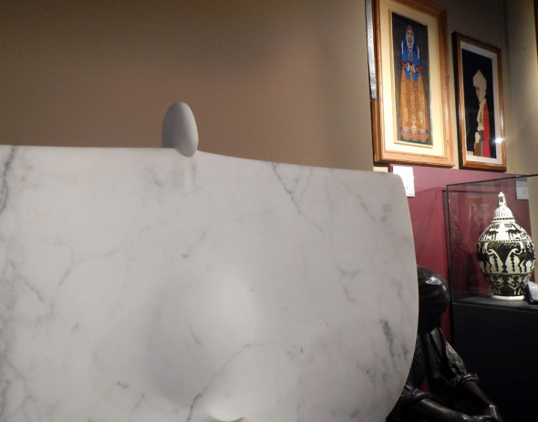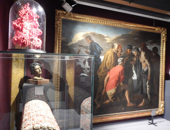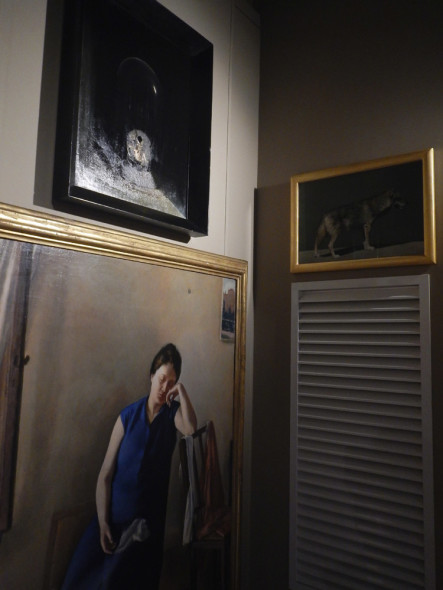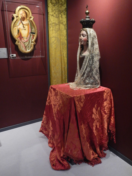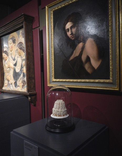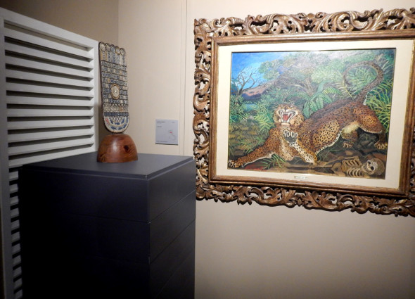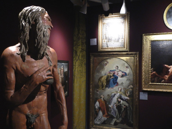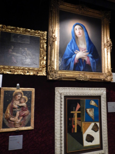 Ecco dei duetti fantastici: un “arazzo” della Rubelli Design Studio (sponsor della mostra) a fianco de “La verità” di Mancini; un “Leopardo” di Ligabue con una specie di stele senza nome e senza un perché (però prova a nascondere un condizionatore); un “San Bartolomeo” di Nicola di Maestro Antonio (Marche) con una Maria incoronata su tavolino di velluto (non c’è nome e regione ovviamente); e via con altre coppiette improbabili a destra e sinistra.
