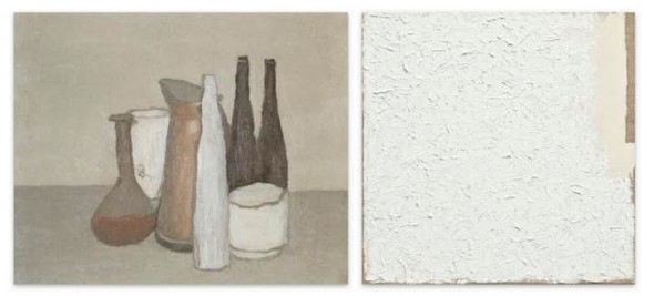 Se l’arte di Morandi si sviluppa in un armonioso ritmo di oggetti, dipinti seguendo linee eleganti che esaltano luci e colori – veri protagonisti della scena – le opere Robert Ryman commistionano pittura e scultura, creando superfici complesse di luci ed ombre. Egli accentua l’oggettualità dell’opera e mette in discussione il limite che separa l’oggetto dallo spazio che lo circonda.
