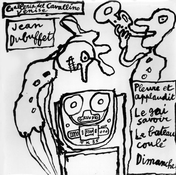 L’art brut si traspone sullo spartito, creando una musica che non deve essere di piacevole contemplazione, ma che vuole alimentare sentimenti e sensazioni che vanno di là del razionale. A partire dagli anni ’60 in poi, accanto all’attività pittorica porta avanti una serie sperimentazioni di musicali sia da solo che in compagnia di colleghi artisti, pittori e intellettuali. Flauti, chitarre, strani strumenti esotici. Dubuffet registra sul nastro magnetico suoni che si susseguono senza logiche prestabilite, accompagnate a tratti da una voce, anch’essa immune alle regole di armonia e melodia. A sostenere i suoi progetti, tra gli altri, Carlo Cardazzo, il gallerista italiano che curò le sue personali a Roma e Milano (luogo della sua prima mostra in Italia). È grazie al suo supporto che, nel 1961, vide la luce un cofanetto contenente sei dischi di Esperienze Musicali composte dall’artista.