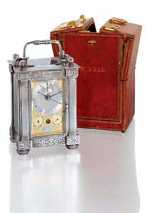 No. 3358, orologio da carrozza estremamente raro ed importante, in argento, con ripetizione dei mezzi quarti, sveglia, calendario, scappamento ad ancora e corredato di valigetta da viaggio numerata in marocchino rosso. Venduta al Principe Serge Galitzine, il 31 marzo 1826, per 3,600 Franchi. Dim. 17 x 9 x 7 cm. (Si tratta dell’unico esemplare sopravvissuto dei tre orologi da carrozza con cassa in argento realizzati da Breguet)