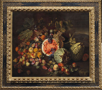 Natura morta con cocomero, meloni, grappoli d’uva, fichi e altra frutta entro paesaggio.