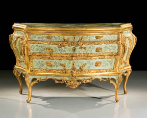 A febbraio (ASTA DI ANTIQUARIATO, con uno spettacolare catalogo a parte intitolato LA COLLEZIONE DI UN GENTILUOMO ITALIANO, 27-2-2007) sono stati battuti gli strepitosi e rari CASSETTONE CON SPECCHIERA DEL XVIII secolo, veneziani, laccati e dorati con decoro a giardino e cineserie. In puro rococò veneziano, i due pezzi riportano agli splendori delle dimore nobiliari del Settecento. In abete, foglia d’oro, tempera e lacca, il comò a tre cassetti di linea mossa ha le gambe arcuate, il piano incassato e dipinto in finto marmo. I due pezzi, battuti separatamente hanno raggiunto ottimi risultati. Il cassettone è stato venduto a 411.400 euro, diventando il risultato più importante della storia della casa d’aste Art. La specchiera, pubblicata dal Morazzoni è stata battuta a 169.400 euro.