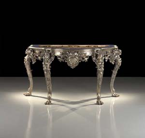 Mentre a giugno nell’asta di lunedì 18 di Argenti, Gioielli e Oggetti d’Arte Russa è stata battuta a 260.000 euro una RARA COPPIA DI CONSOLES IN ARGENTO CON PIANO IN “COMMESSO” IN PIETRE DURE, PORTOGALLO SEC. XX. Il piano è in pietre dure con fascia esterna in lapislazzuli con al centro un paesaggio architettonico con figure e la struttura sottostante, in argento fuso in “cera persa” è rifinita a cesello. Alt. cm. 91,5, largh. cm. 167, prof. cm. 82 peso totale presumibile dell’ argento circa Kg. 150, erano stimate 160.000-200.000 euro.