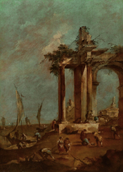 Uno splendido capriccio, opera incontestabile di Francesco Guardi, come conferma, l’esistenza del disegno preparatorio che fa parte del fondo di fogli guardeschi conservati al Museo Correr di Venezia. La tela, che proviene da una raccolta privata inglese, è stata studiata da Egidio Martini, Giuseppe Maria Pilo, Annalisa Scarpa, Dario Succi e Ugo Ruggeri i quali si mostrano assolutamente concordi nell’assegnare il dipinto a Francesco Guardi