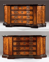 Tra i mobili ottimo si segnala la vendita di una coppia di cassettoni, Brescia, periodo Luigi XIV, in noce interamente intarsiati (lotto 33, cm 107×78,5×219 ciascuno, aggiudicato per 302.000 euro inclusi i diritti).