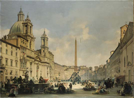 Il dipinto fu realizzato nel 1853 a Parigi dove l’artista viveva in esilio a causa della partecipazione ai moti rivoluzionari veneziani del 1848; Caffi si servì per questa splendida veduta di Piazza Navona di una calotipia del pittore-fotografo padovano Giacomo Caneva, tra i fondatori (1847-1853) della Scuola Romana di Fotografia, uno dei primi circoli fotografici italiani, che aveva abituale ritrovo al Caffè Greco di Roma. Caffi riuscì a rappresentare con grande intensità un momento di vita quotidiana in una delle più celebri piazze romane, celebrata anche dal famoso poeta romano Gioacchino Belli.