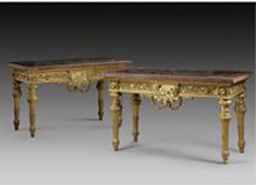 Coppia di tavoli da parete in legno intagliato, scolpito e dorato,