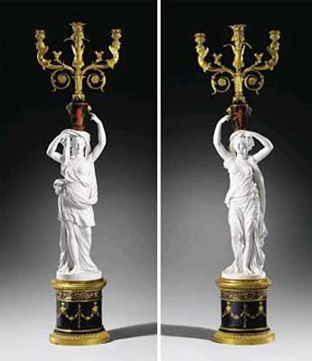 Paire de candélabres d’époque Louis XVI, figures en biscuit de Sèvres, monture de bronze doré attribuée à Thomire