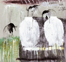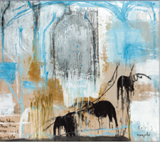 Nelle tele odierne, il nero non solo non assume più funzione strutturale – di pensiero e di pittura – ma torna a svolgere un ruolo che è primariamente quello del disegno, della definizione della forma, lasciando ai colori il compito di costruire la temperatura dell’immagine e la struttura tutta del dipinto. Neri sono, infatti, gli elefanti che compaiono su queste superfici, nera è qualche figura e nere ancora le scritte, gli abitanti di un paesaggio che prende forma attraverso gli ocra, gli azzurri, i verdi, in quello che a oggi si può definire come il ciclo più felice tra i tanti realizzati dall’artista nel corso degli anni. Il nero è il segno inciso, una traccia proveniente da distanze millenarie, è il grafito nella caverna, il primitivo: fuori il sole, la natura, la luce.