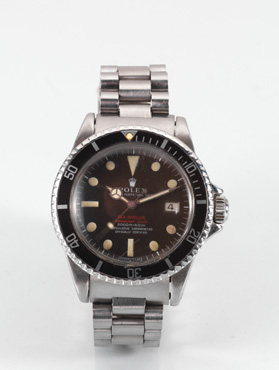 Rolex Oyster Perpetual Date Sea Dweller Submariner doppia scritta rossa 2000 ft=610m, Ref. 1665, quadrante “tropicale”, cassa n. 2247940, fine anni ’60, in acciaioCassa con fondello e corona a vite, lunetta nera graduata girevole, valvola a elio a ore 10 sulla carrure. Quadrante nero con viratura “tropicale” con doppia scritta rossa, minuteria aperta, indici e lancette mercedes fosforescenti, datario ad ore 3 senza lente, secondi al centro. Movimento a carica automatica cal. 1575. Bracciale a maglie Presidenti in acciaio con chiusura a cassetta. Diam. mm 40