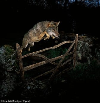 José Luis aveva concepito anni fa questa immagine, quando il primo lupo iberico ritornò ad Ávila nella Castilla y León, regione del nord della Spagna e gli allevatori di bestiame gli dichiararono guerra. La sua idea era di realizzare una foto che simboleggiasse l’antico conflitto tra uomini e lupi e che allo stesso tempo mostrasse la bellezza e la forza di questo favoloso animale. C’è voluto però molto tempo per trovare il luogo perfetto per catturare un lupo che salta una recinzione. L’occasione nacque da un proprietario terriero che permise sia ai lupi che a José Luis di attraversare la sua proprietà, campagna questa che offriva un set ideale: un piccolo bosco con un antico recinto per il bestiame in disuso. José Luis iniziò i suoi appostamenti ponendo della carne nel recinto. Quando riconobbe un lupo maschio, che regolarmente per cibarsi nella proprietà saltava il vecchio cancello, predispose l’equipaggiamento adatto per immortalarlo con la macchina fotografica. Inizialemnte il lupo non gradiva il raggio del flash che partiva ad ogni salto ma dopo una settimana non faceva più caso alla luce e al click della digitale nascosta. Trovato un equilibrio tra la miglior posizione per i macchinari e la quiete dell’animale arrivò il tempo per lo scatto finale con una fotocamera di medio formato. Quando la prima diapositiva fu pronta dal laboratorio, José Luis fu felicissimo di aver ottenuto la fotografia che aveva sempre sognato.