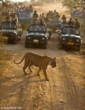 Andy e la sua guida Dicky Singh seguirono la pista di impronte fresche. Quando incontrarono la tigre scoprirono che si trattava di Machali, una femmina molto vicina a Dicky. Infatti è quasi una celebrità locale nel Ranthambore National Park. Non ci volle molto prima che orde di jeep di turisti saltarono fuori per ammirarla. I guidatori mantennero una distanza di sicurezza, ma Machali era ormai abituata a quel tipo di attenzione dei paparazzi della wildlife. Si è ipotizzato che la presenza di Machali abbia contribuito per circa $10 millioni all’economia locale. Andy crede che per salvare questi meravigliosi felini si debba offrire alla popoalzione locale un ritorno economico ed è questo il messaggio che voleva dare con questo scatto.