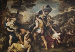 Proviene, come le sette tele già descritte, da Palazzo Cattaneo Adorno uno splendido telone databile intorno al 1680, Il Ratto delle Sabine opera di Luca Giordano; il dipinto originariamente faceva parte della raccolta del banchiere genovese Marcantonio Grillo, poi passò ai Baldi e grazie al matrimonio di Tommasina Baldi con Agostino Adorno confluì a Palazzo Cattaneo Adorno. La grande tela, notificata dal 1962, è valutata 150/250.000 euro. (AGGIUDICATO A: 432,750 euro)
