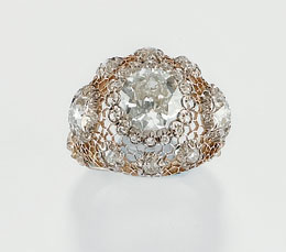 traforo, con diamante centrale taglio vecchio e diamanti taglio vecchio più piccoli ai lati. Con