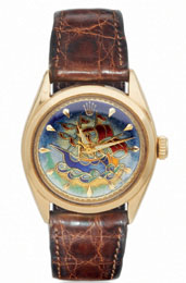 Ref. 6084. Cassa in oro 18 kt in tre corpi, corona a vite, vetro in esalite, lancette a gladio, secondi al centro, fondello bombato, movimento a ricarica automatica, quadrante in oro inciso e lavorato a mano, con decorazioni in smalto. Modello molto raro, prodotto per un brevissimo periodo, fa parte di una serie di quadranti speciali, creati in collaborazione con le fabbriche dei quadranti ai quali si appoggiava la Maison, per sperimentare nuove idee in grado di promuovere competizioni sportive come, in questo caso, l’America’s Cup. Diametro 34 mm, spessore 11 mm.