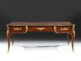 Importante bureau-plat, Francia 1750 circa, firmato Migeon, in palissandro e bois de violette con applicazioni in bronzo dorato, piano sagomato ricoperto in pelle bulinata, fascia mistilinea con tre cassetti, eleganti gambe sinuose con applicazioni e scarpette in bronzo in stile rocaille, cm 201x100x79, piccoli danni. Bronzi punzonati, reca la firma sotto alla fascia e il monogramma NE.
