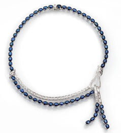 Girocollo in oro bianco, zaffiri e brillanti realizzato ad una fila di zaffiri di taglio ovale entro castoni a griffe, la parte centrale impreziosita da una fila di brillanti entro castoni quadrati e pendente a nappa in zaffiri e diamanti taglio baguette, g 62. Zaffiri per ct 53 circa e brillanti per ct 5,40 circa Aggiudicazione € 10.540