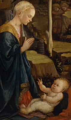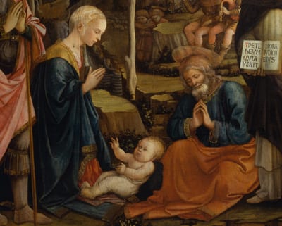 Filippo Lippi e Fra’ Diamante. Natività (Adorazione del Bambino) tra san Giorgio e san Vincenzo Ferrer (particolare) 1456-1457 circa. Tempera su tavola, 158 × 168 cm. Prato, Museo Civico