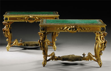 Coppia di tavoli da centro con piani in malachite e sostegni in legno scolpito e dorato, circa 1870, aggiudicato a:€ 162,750