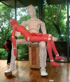 Nel bel Padiglione dell’Australia ci attende un artista che più concettuale non si può. Hany Armanious, molto famoso in Patria, riproduce in calco citazioni dell’arte passata o oggetti poveri, rinvenuti per caso, dei quali riconsidera struttura e funzione e per i quali predispone una nuova modalità di lettura. Il calco non è ottenuto in materiali nobili, come per sottolineare la distanza ulteriore fra la techné dell’artista classico e la propria, ma in poliuretano. L’azione si risolve infine nella distruzione dello stampo e dell’oggetto/matrice originale, sempre nel solco di una contro-metafora del fare artistico. Il calco ottenuto è destinato a divenire opera d’arte e rimarrà unico e non più riproducibile. Per visitare la sua mostra biennalesca “The Golden Thread” mi addentro in una rada selva di scarni pannelli costellati da un gruppetto di puntine da disegno, un testone picassiano che osserva un brutto vaso di cristallo assemblato a un traballante tavolino con abbondante nastro adesivo (“Effigy of an Effigy of Mirage”), un piedistallo rugginoso che regge una tavola di recupero su cui giace un mattone azzurro (“Relative Nobody”, 2010), una figura totemica composta da cesti sovrapposti da cui spunta una “testa” costituita da una teiera rovesciata che contempla un tavolino essenzialissimo (“African with Doctor” opera sul tema assai amato dell’indagine di culture antiche e distanti geograficamente). Ma il messaggio è troppo complesso, artificiale, il procedimento tecnico, che rappresenta in nuce la poetica dell’artista, troppo poco intuibile, troppo sotterraneo. Tutto necessita di eccessiva spiegazione, senza che vi sia un moto spontaneo o un’intuizione poetica più profonda. E’ come se Armanious considerasse se stesso il centro dell’universo e soltanto a sé dovesse rendere conto del suo fare. Un “egoismo” (o un egotismo?) insopportabile.