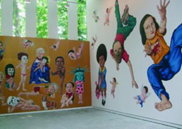La facciata del Padiglione è occupata dall’immenso murales “Imposition Symphony” di Stelios Faitakis (Grecia, 1976) che nello stile dell’iconografo bizantino illustra in 6 capitoli i principali episodi della storia recente di repressione, censura e illibertà. Zhang Dali (Cina, 1963) presenta 22 immagini di propaganda (“A Second History”, 2003-2010), sottolineando il ruolo fondamentale del mezzo fotografico per la costruzione infingarda di una realtà parallela e lontana dalla verità. Taryn Simon (USA, 1975) con “Zahra/Farah” espone l’immagine sconvolgente del frame finale di un film di Brian De Palma (Redacted) sulla storia di Farah, ragazza irachena (interpretata dall’attrice Zahra poi esule politica in USA a causa di questa partecipazione) rapita, stuprata e infine uccisa insieme alla sua famiglia, sterminata mentre si consumava la violenza sulla giovane, da soldati USA nel 2006. La tragedia, il cui film venne contrastato sia in Iraq che negli Stati Uniti, ritorna in tutta la sua terribile evidenza nel libero padiglione danese. Tala Madani (Iran, 1981) documenta in piccoli quadretti dal tratto infantile, crudo, grottesco e fortemente espressionista, il sopruso operato – per lo più dal maschio ma non solo – nella quotidianità del singolo come nelle fondamentali espressioni di una società ben strutturata. Han Hoogerbrugge (Olanda, 1963) invia in un gustoso video animato (“Quatrosopus”) la sua percezione personale circa i responsabili contemporanei della costrizione che in vari modi obbliga al silenzio. Si sorride acidamente quando, fra le vignette, appare un Berlusconi connotato dal sorriso da Gatto del Cheshire con cui viene ormai identificato dall’occhio straniero…