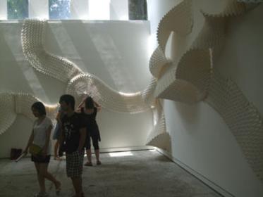 Ben più accogliente lo scarpiano Padiglione del Venezuela presenta, in una ridda lievemente dissonante nell’allestimento il cui titolo è non a caso “Espacios”, le opere costruite in loco da Clemencia Labin, la grande teoria di comic stickers di Francisco Bassim (1964) le cui fattezze mischiano di volta in volta sacro (cultural-religioso) con profano (popolare) nel tentativo di ripercorrere senza scarto semantico fra eroi veri e supereroi immaginari la storia dell’uomo. Divertente senz’altro. E, nell’ultima stanza, elegante e coinvolgente (anche per la luce morbida che entra sorniona dalle alte vetrate) la lunga “sciarpona” bianca di cotone piegato a mano, arricciata e appuntata in varia foggia estetica lungo le pareti (titolo evocativo: “Solaris”) di Yoshi. Allestimento astuto, ma indubitabilmente affascinante, se pur privo di vera tensione poietica. Voto:5/6.