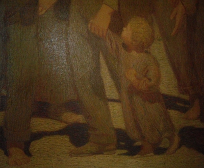 Il quadro ha bisogno di profondità come pure della possibilità d’esser “sentito“, a tu per tu e senza barriere, osservato da vicino in ogni tratto di pennello, nei contrasti e negli accordi della luce, nella sovrapposizione dei pigmenti colorati. L’opera dev’essere percepita e “ascoltata“, come può cogliersi l’incedere silenzioso e deciso dei braccianti in protesta in siffatto luogo?
