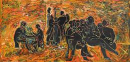 signed and titled on the reverse, waterpaint on canvas and laquered wood, executed in