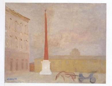 L’assunto pittorico di C. Q. è un discorso poetico, emozionale, quasi di traenza impressionistica che discute su opere di media e piccola dimensione: la formula visiva presenta una soggettistica mirata, tra il paesaggismo e la panoramica urbana dove fluidificano elementi di vario assortimento, desunti da luoghi e contesti cari al maestro negli anni di maggiore produzione. Il suo travaglio esecutivo è rapido, ma la pennellata definisce le tematiche con un nervoso letargismo nel segno. Epicentro del suo discorso estetico è una pittura assoluta, tersa, fatta di macchie e campiture, dove il contenuto cromatico vive nel suo completo stato azzerante. La perturbazione visiva, il “riconoscimento” degli elementi da parte del fruitore, avviene nei cartoni di Quaglia attraverso l’impatto su brevi e lesti tocchi di pennello che, timidamente, accennano un particolarismo di significazione (così sullo scenario compositivo si fanno luce finestroni, portali, fregi e cornicioni. Senza di essi, la Roma di Quaglia sarebbe una città diluita nel paonazzo della campitura e nel biondo della solida pennellata). Il filo rosso che collega la materia mentale del maestro con la sua romantica tecnica adottata è da ricercare lontano, nelle notti insonne, prigioniero nel corpo e nello spirito sotto l’incombente ombra nera di conflitti e distruzione, solo ed esiliato dal mondo suo. È li, in quel microcosmo interiore che quel filo rosso si annoda ad una pittura emozionale. Un passaggio obbligato nella trascendenza attraverso pennelli e cavalletto. Sul piano pittorico di C. Q. la dominante cromatica vive una lunga stagione di protagonismo. All’interno della forma, seppure nervosa a volte frammentaria, la regione estetica pullula di colori lirici, incrociando tangenti di tonalità passionali. I palazzi, le strade le vedute e gli scorci di Quaglia si riscaldano, assumendo un processo di decantazione sui rettangoli dipinti. L’acume estetico è evidente e si fa strada attraverso un reso cromatico dall’abile sensualismo: i vermigli coagulanti infiammano il sanguinolento spazio d’azione, mentre l’oro più acceso delle calure romane è uno sfavillio venuto dal cielo, che indora scorci e monumenti ed è un qualcosa di mistico, tra il sole e Dio. Utilizza spesso un telaio operativo di perimetro modico, dove la modulazione del pigmento crea un campo ricettivo dall’impeto febbrile, penetrante, mentre il groviglio caldo e fumante dei colori attira a sé l’occhio innocente con astuta strategia. Una pittura di penetrazione, dunque. La sua pittura è immersiva. L’unico dato affiorante è il dosaggio del bianco che, come isola chiara in un oceano di fuoco, illumina saliente l’intera orditura cromatica. Sulla complessità nel definire i suoi margini, basterà aggiungere che Quaglia è artista di un tempo interiore, non biologico (nelle sue opere la componente antropica è rara, talvolta completamente revocata). Il suo lavoro si applica in una cellula compositiva sognante, che vacilla costantemente in un sostrato onirico. È l’angelo dei pennelli caduto negli inferi di Roma, tra demoni urlanti, sulle piazze arse da fiamme roventi. È pronto a spiccare il volo, ma prima traccia sul suo cartone gli incubi affumicati dell’infernale città eterna. Dall’alto, da lontano, le angosce e i misteri non fanno paura. Carlo Quaglia li ha fissati lì, sui suoi lavori. Eternati come piccole, infernali memorie di un viaggio, racchiuse nel diario celeste di un divino sognatore alato.