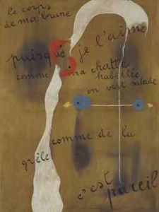 “Painting-Poem (“le corps de ma brune puisque je l’aime comme ma chatte habillée en vert salade comme de la grêle c’est pareil”)”, 1925, Joan Miró (1893-1983) aggiudicato a: £16,841,250 ($26,609,175 / €20,243,183) – a world record price for the artist at auction (stima: £6-9 milioni).