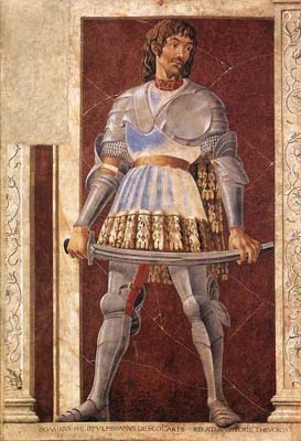 Vedete ancora, di lui, il Niccolò da Tolentino (in alto a sinistra) – pendant al Giovanni Acuto di Paolo Uccello (in alto a destra) – sulla parete interna del Duomo di Firenze. Un confronto fra le due opere vi può condurre a comprendere la differenza essenziale fra la linea funzionale e il sintetismo prospettico di cui Paolo Uccello fu, per l’appunto, iniziatore. Nel cavaliere di Andrea del Castagno la fonte di luce è meno risoluta e serve pià che altro ad affondarsi in guisa nell’intrico del modellato da far risaltare la muscolosità del destriero con una specie di rabesco superficiale d’anatomia (la zampa posteriore soprattutto). L’animale torce il viso verso di noi, nitrendo, così da formare altre cordonate sottocutanee espresse con altre linee: e per maggiore istantaneità di moto è immaginato sollevando già uno degli zoccoli posteriori; perfino un particolare infimo, la coda, si ritorce nervosamente come cerando di liberarsi dal nodo robusto e vincoloso. Il Tolentinate irrigidisce vibrando le gambe a calcar le staffe: mentre schioccano nell’aria il martelletto e il nastro del collarino; ma non per formare uno svolazzo calligrafico poiché – voi vedete – conservano peso e vita e già stanno per cadere.