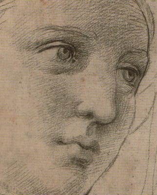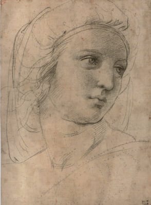 Ora unanimemente riconosciuto come disegno preparatorio per la testa della Musa terza a destra di Apollo, il disegno è stato identificato in passato con altri nomi: quando fu inciso da Picart nel 1725 fu descritto semplicemente come “The Head of a Woman” mentre quando fu esposto alla Woodburn Gallery nel 1836 acquisì più romanticamente il titolo “Ritratto della sorella di Raffaello” pensando fosse essere uno studio di testa per Galatea nel celebre affresco eseguito nel 1512 presso la Villa Farnesina a Roma.