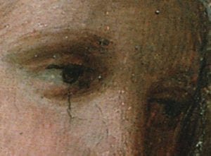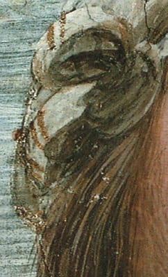 In un altro tondo volto verso la finestra che guarda in Belvedere, è finta Poesia, la quale è in persona di Polinnia coronata di lauro e tiene un suono antico in una mano et un libro nell’altra e sopra poste le gambe; e con aria e bellezza di viso immortale sta elevata con gl’occhi al cielo, accompagnandola due putti che sono vivaci e pronti e che insieme con essa fanno vari componimenti, e con le altre e da questa banda vi fé poi, sopra la già detta finestra, il monte di Parnaso. Nell’altro tondo, che è fatto sopra la storia dove i Santi Dottori ordinano la messa, è una Teologia con libri et altre cose attorno, co’ medesimi putti, non men bella che gl’altri. (…)