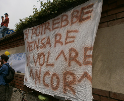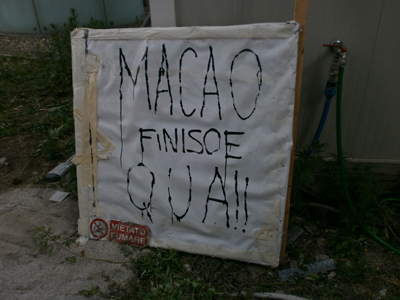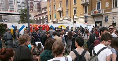Macao prosegue allora all’aperto, tutti in cerchio e tutti giù per terra: assemblea pubblica per decidere il da farsi, collegamenti telefonici con esponenti delle varie sedi occupate in giro per il bel paese. “Non è questione di spazi, è questione di democrazia“. Il presidio procede: il benzinaio di fronte si trasforma nella Base Macao, si tengono lezioni universitarie davanti alla trattoria sull’angolo, la gente continua ad affluire, un andirivieni per tutto il pomeriggio. Musica, spettacoli e tavoli di lavoro. Nessuno se ne vuole andare.