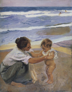 “A la Orilla del Mar” raffigura un incantevole scenario che descrive la vita quotidiana in riva al mare a Valencia (la madre con il bambino è un’iconografia molto cara al pittore). Si prevede che realizzi 700.000/1.000.000 sterline. Il dipinto ha tutte le caratteristiche dello stile maturo Sorolla: una tavolozza brillante e pennellate ampie. “A la Orilla del Mar” è stato esposto a New York alla mostra dedicata a Sorolla presso l’Hispanic Society of America nel 1909, e successivamente è stato esposto anche a Buffalo e Boston. L’esposizione era stata una grande successo: quasi 200 delle 356 tele inviate, erano state vendute. Solo a New York avevo visitato al mostra 160.000 persone.