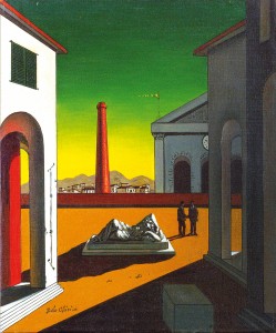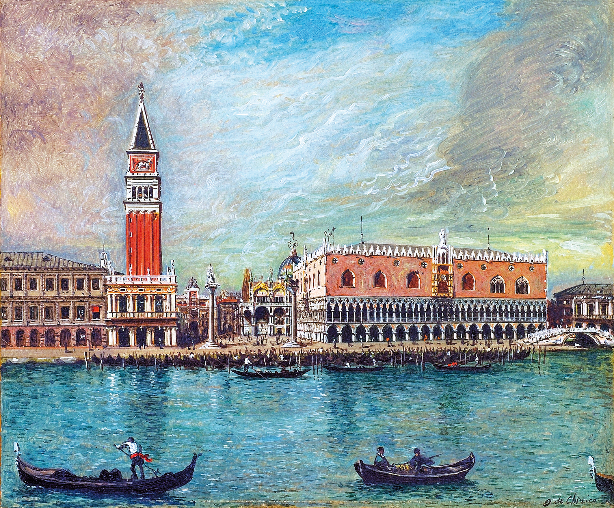 Nella selezione di opere della Collezione Orlandi che saranno battute da Wannenes vi è una splendida e silente Piazza d’Italia-Malinconia Torinese (stima 120/150.000) di GIORGIO DE CHIRICO del 1957. E’ un olio su tela, firmato in basso a sinistra, in cui la nitida prospettiva delle architetture porta lo sguardo dritto all’orizzonte su cui si staglia una vigorosa ciminiera rossa e un tempio-stazione con l’orologio che misura le ore delle “idee perdute”.