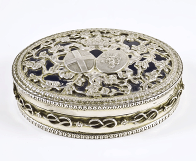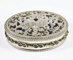Tra gli altri lotti, si segnala una rara bomboniera del matrimonio di Umberto II di Savoia con Maria José del Belgio. Umberto di Savoia volle disegnare lui stesso la bomboniera per le sue nozze con la Principessa del Belgio avvenute a Roma nel gennaio del 1930. La bomboniera regale è in argento, di forma ovale cm 10x 8.5, sul coperchio i gli stemmi degli sposi contornati da fiori d’arancio su un cuscino di smalto blu, il bordo della scatola contornato da nodi Savoia intercalati da rosette. La bomboniera è stata realizzata dall’antica gioielleria Musy di Torino. Ormai una rarità l’esemplare, che è stato esposto a Venaria nella mostra dedicata ai Savoia, sarà battuto il 7 giugno con un prezzo di stima di euro 3.200,00. Per gli appassionati del settore storico sarà in asta anche uno stendardo in seta stampata realizzato in occasione delle nozze di Anna Maria luisa de’ Medici e una collezione di insegne di ordini cavallereschi in oro, argento e smalti del XIX secolo.