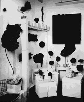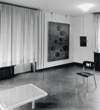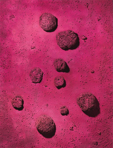 Entrambi i rilievi hanno l’aspetto di un “paesaggio lunare”. E non è un caso. Sono stati realizzati proprio nel periodo della cosiddetta “corsa allo spazio”. “Le Rose du bleu (RE 22)” è composto da nove grandi spugne sparse nella tela insieme a piccole pietre legate da un intenso pigmento rosa. Mentre il “Relief éponge bleu (RE 51)” è composto da molte più spugne e pietre, disposte in gran parte sui bordi e legate dal pigmento blu.