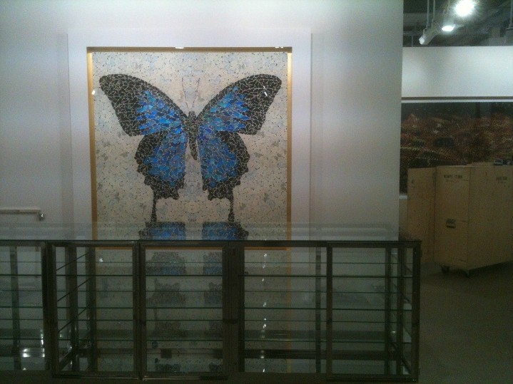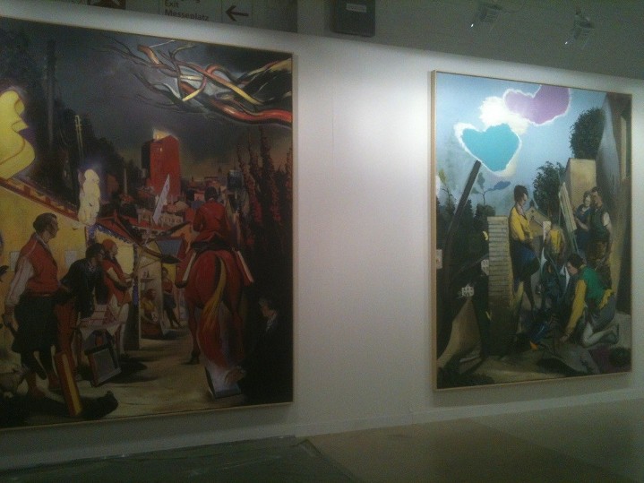 Da lontano ho visto in fondo a un corridoio due Neo Rauch da Eigen art, veramente potenti, due quadri veri, un’immagine surrealista che rompeva lo spazio poi da Contemporary fine art dei collages dei gemelli Tobias, molti Kounellis qua e là con cappotti e senza, un Damien Hirst con una farfalla fatta da un miliardo di farfalle e mi sono domandato qual è il limite tra arte e decorazione e perché Gerard Richter invece non è mai decorativo, due Robert Longo con delle teste di tigri, molto belli, un Pistoletto da Continua, mentre nello stand Galleria dello Scudo una stanza con dei Vedova che poteva essere degna di un museo tedesco, poi dei Fontana barocchi, e lì dietro anche due quadri di Martin Disler, un artista svizzero morto troppo giovane ma sempre vivo, e un Nicolas De Stael piccolo come un gioiello.