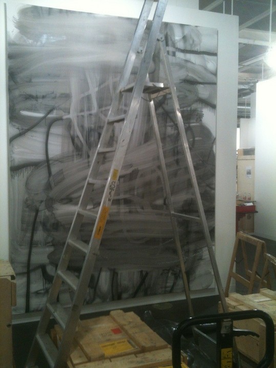Basilea, 10 giugno 2012 – Art Basel è una macchina da guerra impressionante. Ieri ci sono stato, aller-retour, per sistemare un mio quadro esposto dalla Galleria dello Scudo che aveva un rigonfiamento della tela. Artemide è il titolo del quadro, un quadro bianco appena finito e stava al terzo piano nei depositi, dove le gallerie hanno le opere non esposte, tutte in casse di legno, una per una, divisi per stand, una quantità impressionante di capolavori di cui fuori leggi solo il nome o al massimo una piccola foto. Tutto questo già di per sé è un opera d’arte.