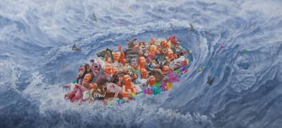 Con lo stesso titolo 2005-2007 è anche il grande dipinto lungo 17 metri in cui il vortice è formato da uccelli e miliardi di insetti che tendono a raggiungere un punto indefinito all’orizzonte. Ancora un bambino è protagonista di 2007.4.6, opera scelta per essere l’immagine guida della mostra. Un neonato immerso in un’acqua scura piange disperato ed è circondato da libellule colorate, piccole ma fastidiose creature che forse rappresentano le future difficoltà dell’esistenza.