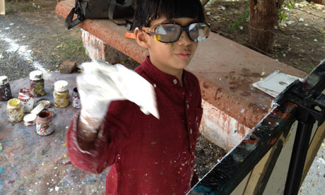 Come tutti i grandi il bambino dispone di assistenti personali per sbrigare le faccende più noiose (nel suo caso le due sorelle maggiori e un assistente del padre). Sistemato su una stuoia di plastica, Shorya passa in rassegna la sua collezione di acrilici e dice al servo quale colore aprire. “le sue mani sono troppo piccole per aprire i tappi”- spiega il padre orgoglioso, che ha organizzato la prima mostra al Taj Hotel di Mumbai lo scorso anno.