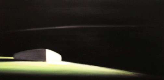Una pittura rigorosa che predilige pochi elementi ottenuti da semplici e nette campiture di colore, luoghi misteriosi e suggestivi, che sono al limite tra l’idea del paesaggio e di un’astrazione, ottenendo un risultato di assoluta preziosità ed eleganza.