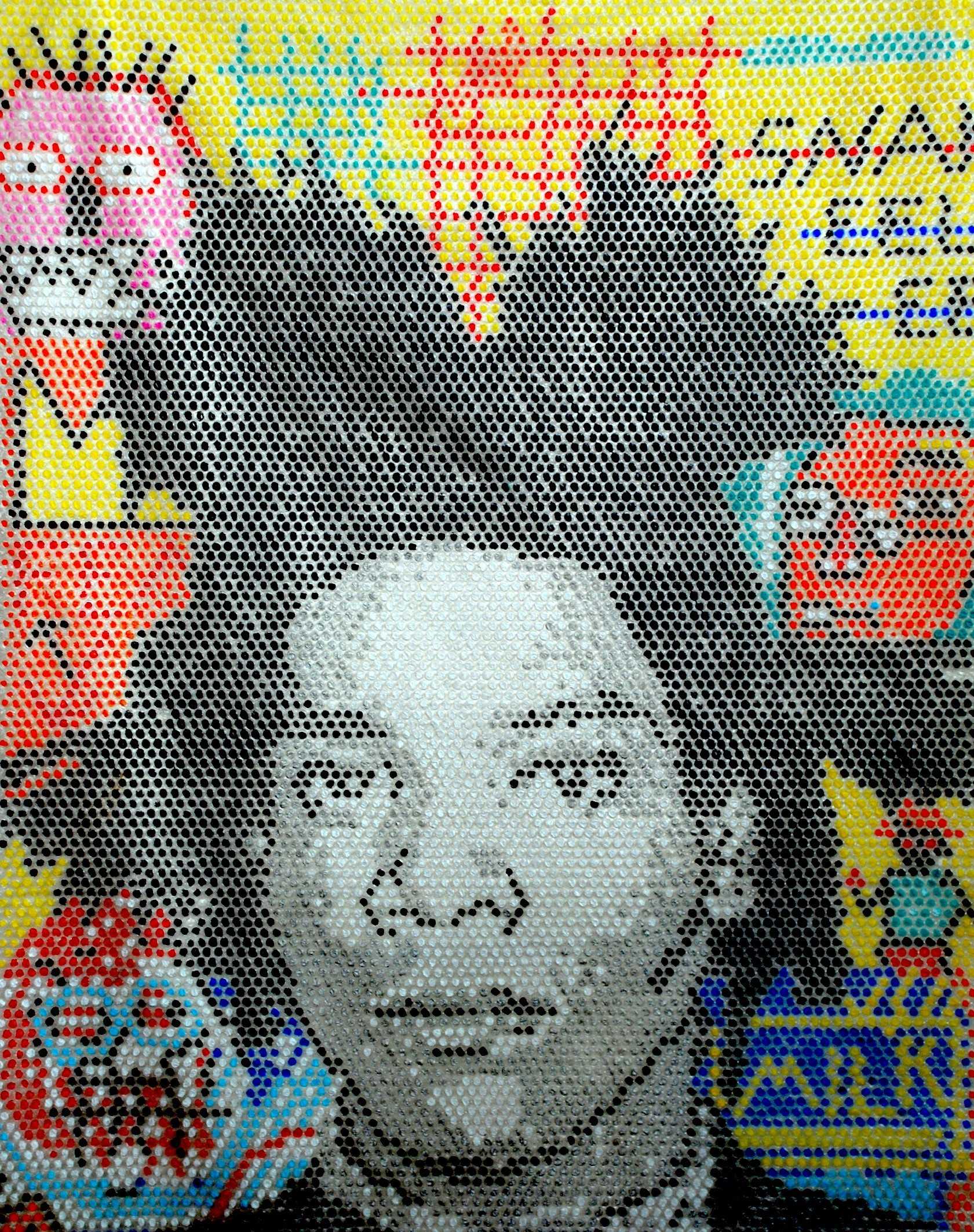La veemenza con cui l’artista compone i volti di personaggi dello showbiz, disponendo minuziosamente i suoi chiodini colorati o dipingendoli sul pluriball, sconfina in una ripetizione allucinata di piccoli elementi accostati con un’energia che Bee assimila alla fisica. L’oggetto artistico è per lui una composizione di materiali sottoposti all’applicazione di energie fisiche e mentali e il dispendio di energie che richiede la creazione artistica ha la peculiarità di non crearsi o distruggersi ma solo di trasformarsi, proprio come avviene con la materia nei cicli biologici. Questa accumulazione eccessiva, simbolo di una frammentazione schizofrenica personale e collettiva, crea dei cortocircuiti di senso nelle sue immagini apparentemente innocue, dove i parametri cognitivi con cui tutti noi interpretiamo la realtà, “forma, profondità di segno, spettro visivo e contenuto iconico, sono sottoposti ad una continua, impercettibile, inarrestabile trasformazione in altri stati” (T. Bee), nel tentativo di recuperare il tempo biologico dell’uomo contemporaneo, investito dal mondo dei mass media da troppi stimoli sensoriali e ambizioni.