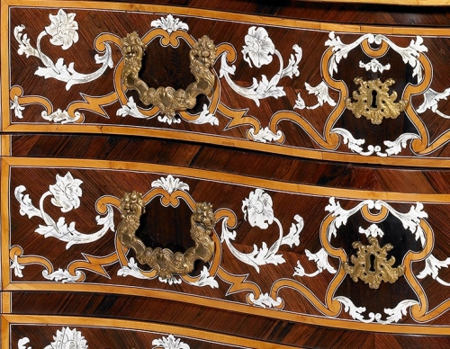Tra le vetrate del Grand Palais presenterà una tempera di Francesco Traini raffigurante la Vergine col Bambino del 1325, ma anche Les trois Grâces couronnant l’Amour di Nicolas Colombel (1690 circa) e Ercole e Acheloo di Orazio Riminaldi del 1625. Tra le opere di qualità museale un comò di Pietro Piffetti (nell’immagine un dettaglio) intarsiato in legni rari e madreperla (1730-1740).