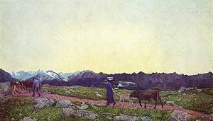 Il tema delle montagne, infatti, è un leitmotiv nelle opere del pittore, che nel 1886 lascia l’Italia per trasferirsi a Savognino, nel cantone Grigioni, e da lì nel 1894 sceglie poi l’Engadina come dimora sino al giorno della sua morte, che lo coglie sulle vette del rifugio Schafberg – poi ribattezzato Capanna Segantini – dove si era spinto per dipingere il celebre Trittico della Natura, rimasto incompiuto.