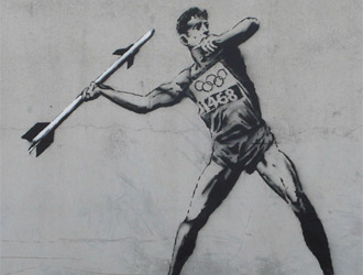 I due atleti disegnati dal famoso street artist Banksy sui muri di Londra per le Olimpiadi sono a rischio cancellazione. Negli ultimi mesi, infatti, le autorità britanniche hanno intrapreso un’attività di ripulitura della capitale dai graffiti sfociata, pochi giorni fa, perfino nell’arresto di alcuni artisti, tra cui Darren Cullen. Non a caso, varie opere di Banksy sopravvivono ormai solo su Google Street View o nei siti che fanno raccolte fotografiche delle immagini. In proposito il blog di immagini «La freccia ferma», ha in corso una “mostra” virtuale delle migliori opere di Banksy tratte proprio dal servizio Street View di Google.