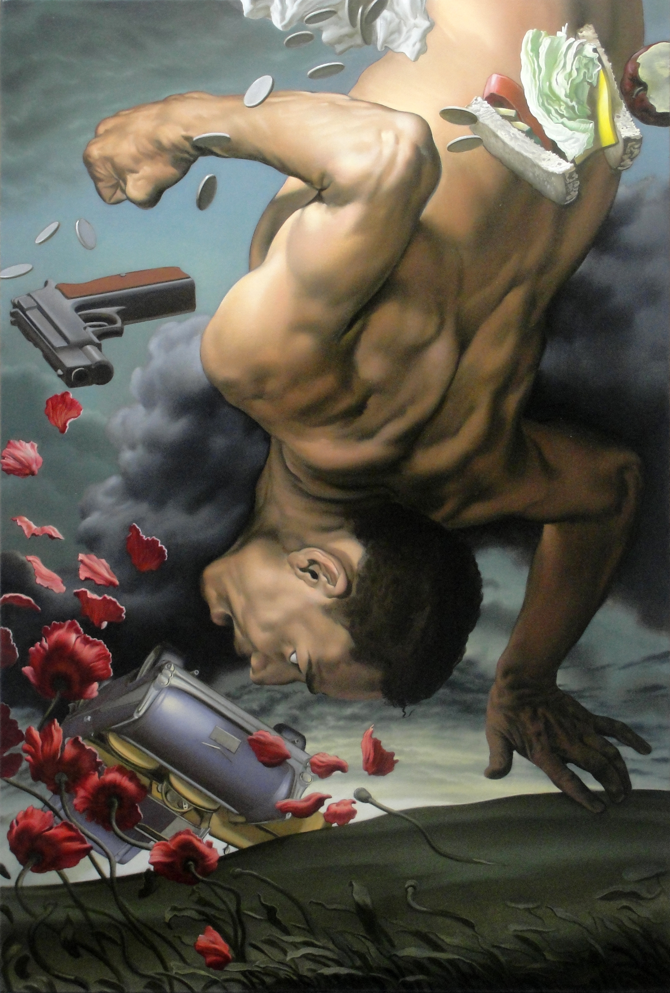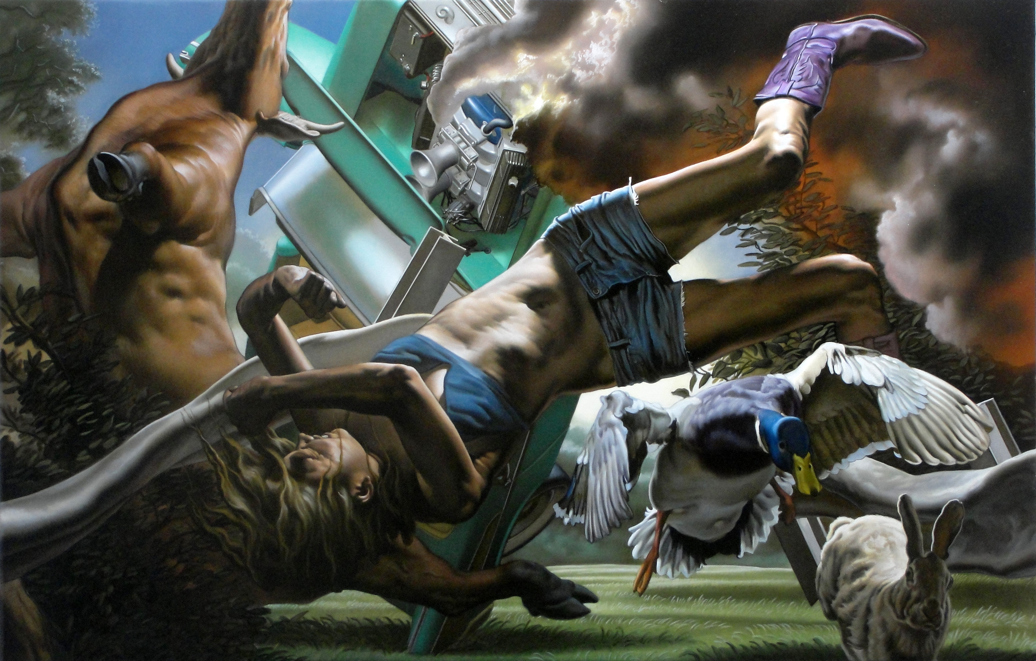 I tuoi dipinti sono pervasi di immagini allegoriche e il tuo stile riporta alla mente il classicismo ma anche il fumetto, il fantasy. Al limite della pop art, del surrealismo, dell’iper realismo. Perché questo stile e non un altro?